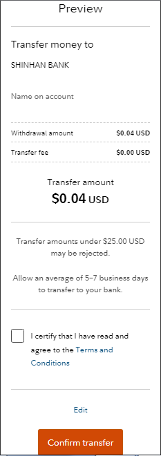 우선 25불 이하면 인출이 안되니 그 점은 참고하고, Fee가 보통 금액 커지면 일부 붙는다.