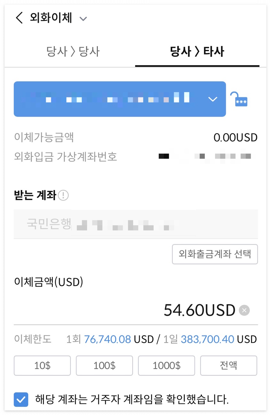 ’KB국민은행으로 이체‘를 고르고, ‘외화계좌>외화계좌’로 선택한 후, 아까 본 키움증권의 외화 가상계좌를 입력해 준다.